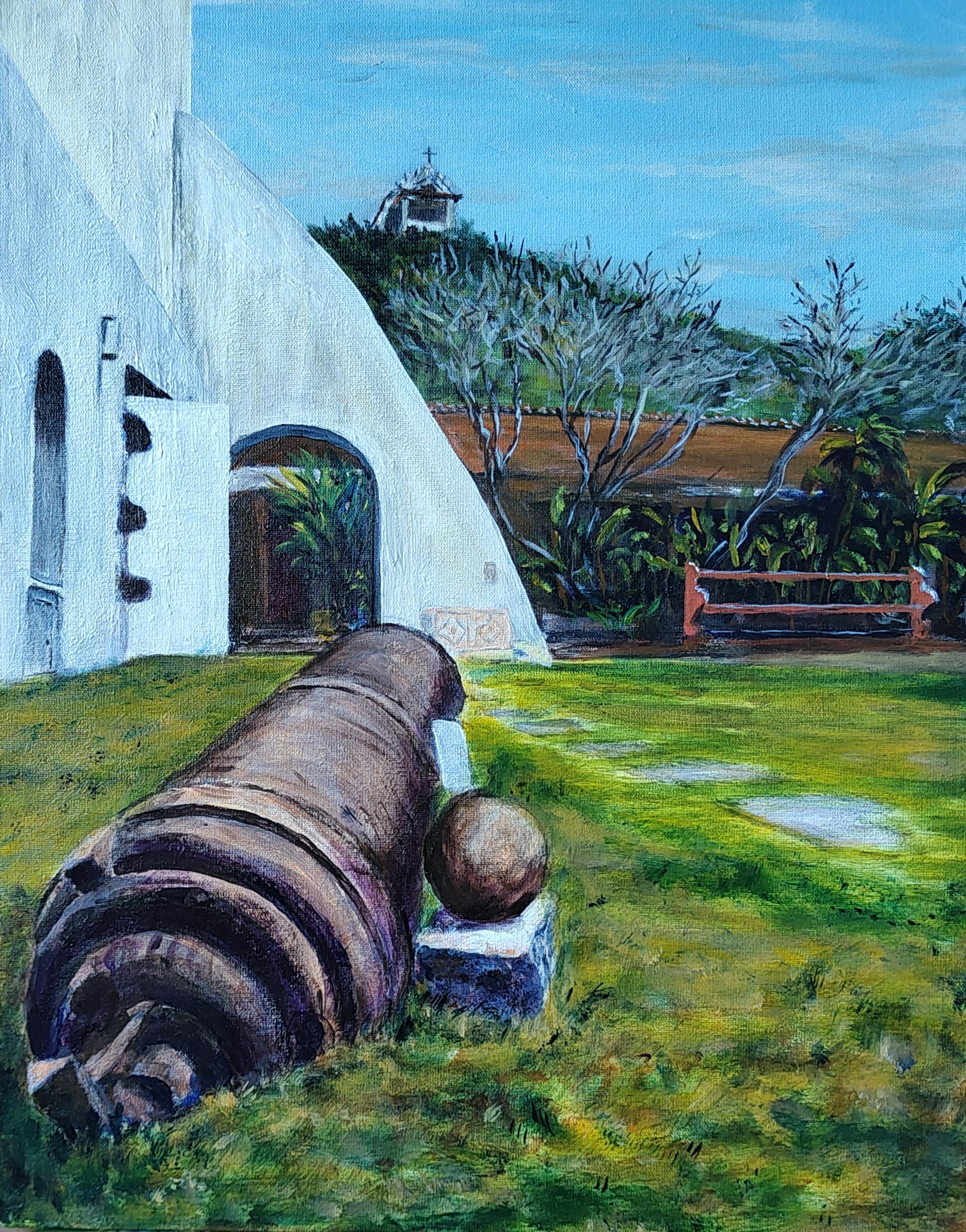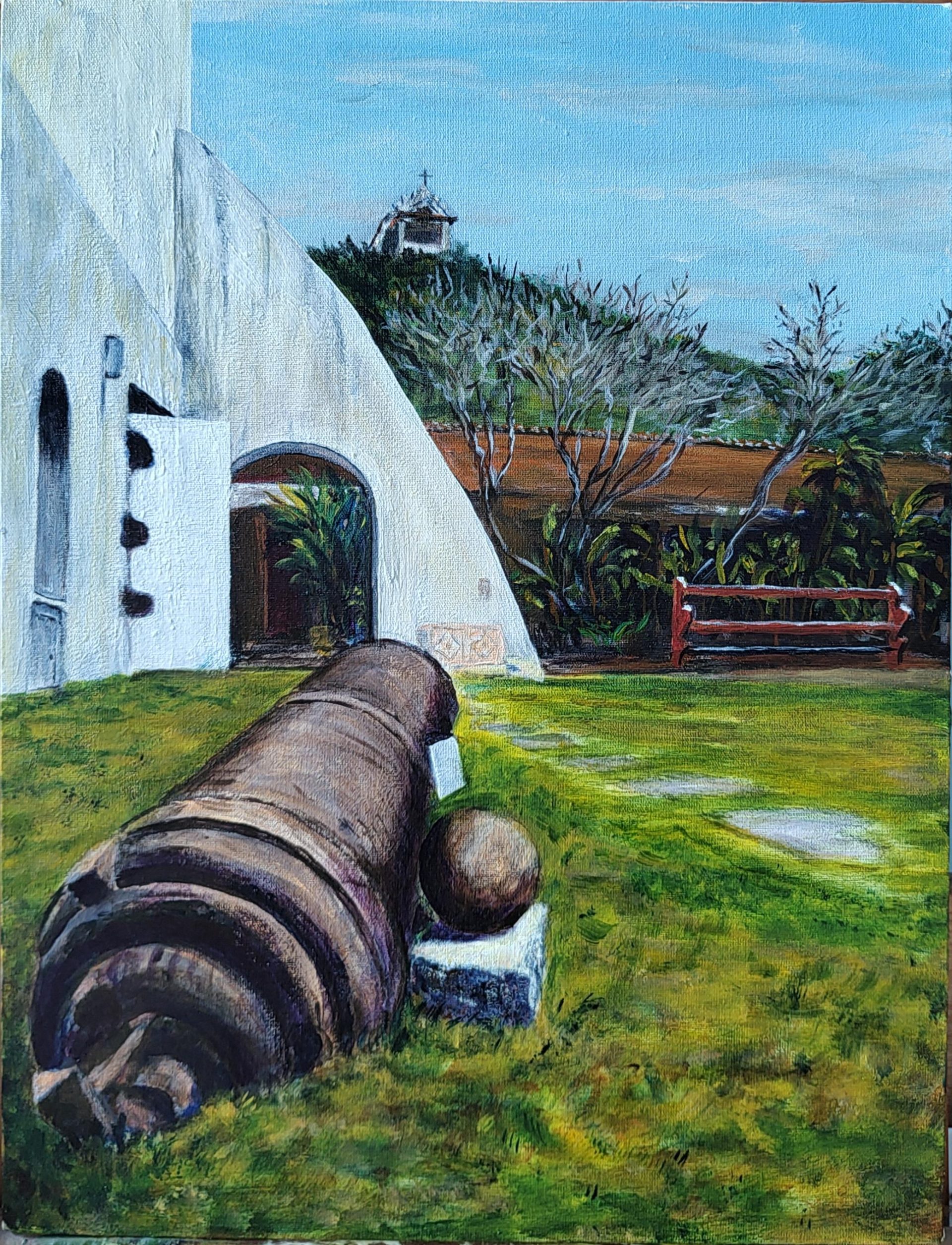 Ao chegar ao local, cada artista participante escolheu uma cena do museu para pintar. Posicionei meu cavalete no lado esquerdo do pátio, próximo da capela (que eles chamam de “nave”), pois me encantei com a presença de um pequeno canhão “Caronada”, que equipava navios ingleses no século XVIII. O mesmo faz parte do acervo do museu e apontava para o fundo do terreno, onde fica localizado o “Morro da Guia” e sua tradicional capelinha (equipamento turístico da cidade). Escolhi o ângulo mais próximo ao terreno, de modo que o efeito de perspectiva criasse a ilusão de aumento do canhão (foto abaixo, usada como referência para conclusão da obra). Mudei pouca coisa do cenário — aparei ligeiramente a vegetação que encobria a capelinha do Morro da Guia, para deixá-la em evidência.